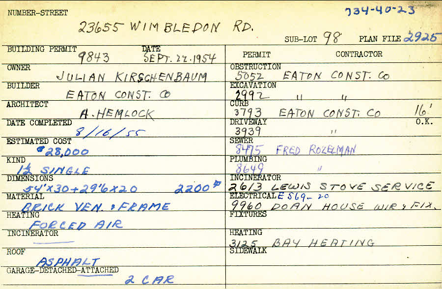 23655 Wimbledon Road Shaker Heights, OH 44122 PARCEL ID: 734-40-023 Building Permit Date: 09-22-1954 Plan File Number: 2925 Microfilm Roll: Roll#41, Roll#42 Neighborhood: Mercer Owner: Kirschenbaum, Julian Builder: Eaton Construction Company Architect: Hemlock, A. Estimated Cost: 28000 Date Completed: 08-16-1955 Kind: Single, Single Residence or Dwelling Material: Brick Veneer and Frame Heating: Forced Air Roof: Asphalt Garage: attached 2 car |