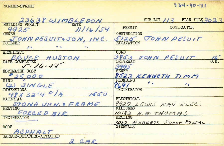 23638 Wimbledon Road Shaker Heights, OH 44122 PARCEL ID: 734-40-031 Building Permit Date: 11-16-1954 Plan File Number: 3023 Microfilm Roll: Roll#43 Neighborhood: Mercer Owner: John Pesuit and Son, Inc. Builder: John Pesuit and Son, Inc. Architect: Huston, Bruce Estimated Cost: 25000 Date Completed: 05-16-1955 Kind: Single, Single Residence or Dwelling (2) Material: Stone Veneer and Frame Heating: Forced Air Roof: Asphalt Garage: attached 2 car |