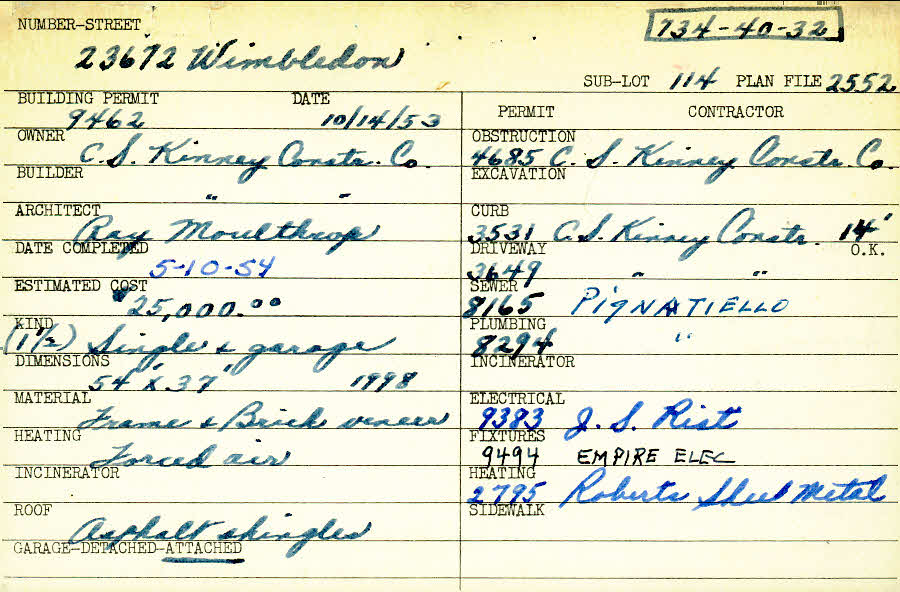 23672 Wimbledon Road Shaker Heights, OH 44122 PARCEL ID: 734-40-032 Building Permit Date: 10-14-1953 Plan File Number: 2552, 6785, 7252 Microfilm Roll: Roll #36, Roll#88, Roll#92 Neighborhood: Mercer Owner: C. S. Kinney Construction Company Builder: C. S. Kinney Construction Company Architect: Moulthrop, Ray Estimated Cost: 25000 Date Completed: 05-10-1954 Kind: Single Dwelling and Garage Material: Frame and Brick Veneer Heating: Forced Air Roof: Asphalt Shingles Garage: attached |