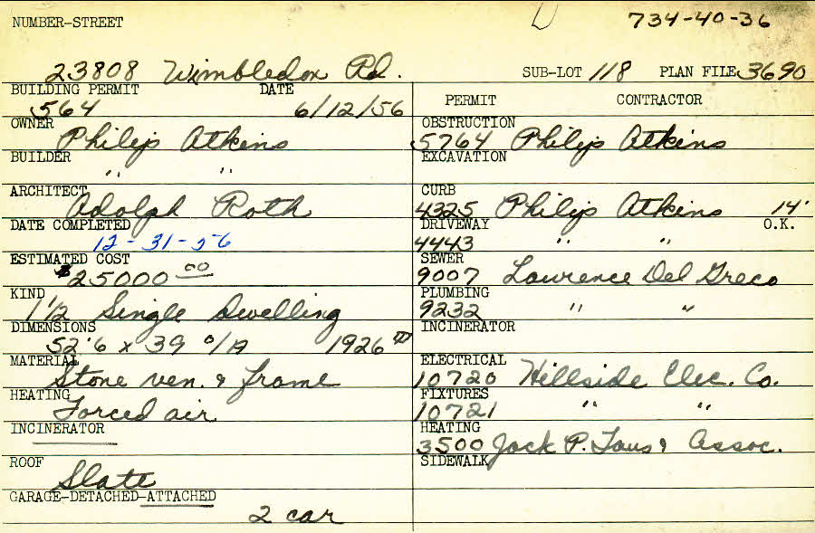 23808 Wimbledon Road Shaker Heights, OH 44122 PARCEL ID: 734-40-036 Building Permit Date: 06-12-1956 Plan File Number: 3690 Microfilm Roll: Roll#55 Neighborhood: Mercer Owner: Atkins, Philip Builder: Atkins, Philip Architect: Roth, Adolph Estimated Cost: 25000 Date Completed: 12-31-1956 Kind: Single, Single Residence or Dwelling Material: Stone Veneer and Frame Heating: Forced Air Roof: Slate Garage: attached 2 car |