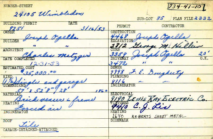 24105 Wimbledon Road Shaker Heights, OH 44122 PARCEL ID: 734-41-010 Building Permit Date: 03-16-1953 Plan File Number: 2332 Microfilm Roll: Roll#34 Neighborhood: Mercer Owner: Ogella, Joseph Builder: Ogella, Joseph Architect: Metzger, Charles A. Estimated Cost: 35000 Date Completed: 12-31-1953 Kind: Single Dwelling and Garage Material: Brick Veneer and Frame Heating: Forced Air Roof: Tile Garage: attached |