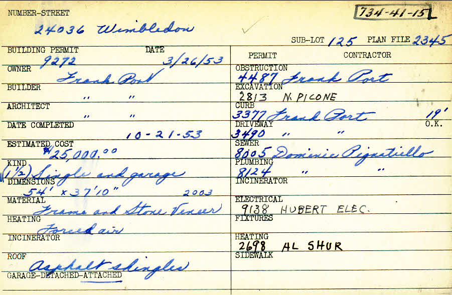 24036 Wimbledon Road Shaker Heights, OH 44122 PARCEL ID: 734-41-015 Building Permit Date: 03-26-1953 Plan File Number: 2345 Microfilm Roll: Roll#34 Neighborhood: Mercer Owner: Port, Frank Builder: Port, Frank Architect: Port, Frank Estimated Cost: 25000 Date Completed: 10-21-1953 Kind: Single Dwelling and Garage Material: Frame and Stone Veneer Heating: Forced Air Roof: Asphalt Shingles Garage: attached |