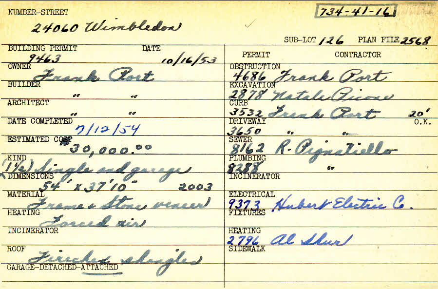 24060 Wimbledon Road Shaker Heights, OH 44122 PARCEL ID: 734-41-016 Building Permit Date: 10-16-1953 Plan File Number: 2568, 3686 Microfilm Roll: Roll #36, Roll#55 Neighborhood: Mercer Owner: Port, Frank Builder: Port, Frank Architect: Port, Frank Estimated Cost: 30000 Date Completed: 07-12-1954 Kind: Single Dwelling and Garage Material: Frame and Stone Veneer Heating: Forced Air Roof: Shingles Garage: attached |