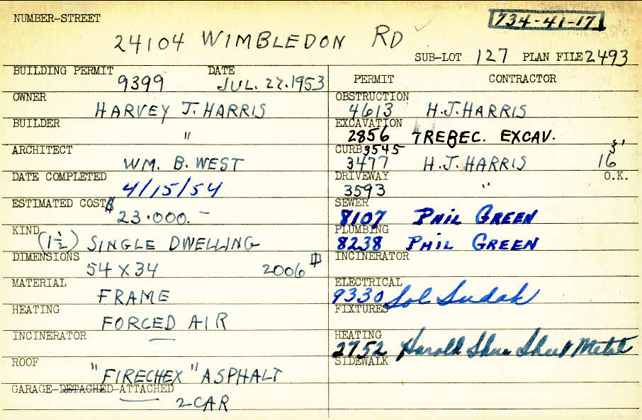 24104 Wimbledon Road Shaker Heights, OH 44122 PARCEL ID: 734-41-017 Building Permit Date: 07-22-1953 Plan File Number: 2493 scanned, 5646, 12116 Microfilm Roll: Roll035, Roll#76, NewRoll#11 Neighborhood: Mercer Owner: Harris, Harvey J. Builder: Harris, Harvey J. Architect: West, William B. Estimated Cost: 23000 Date Completed: 04-15-1954 Kind: Single, Single Residence or Dwelling Material: Frame Heating: Forced Air Roof: Asphalt Garage: attached 2 car |