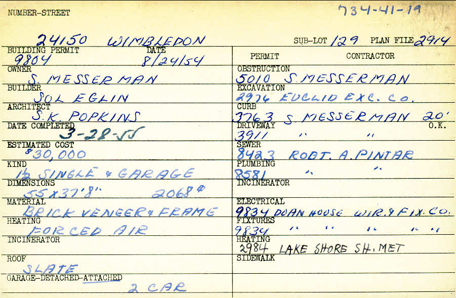 24150 Wimbledon Road Shaker Heights, OH 44122 PARCEL ID: 734-41-019 Building Permit Date: 08-24-1954 Plan File Number: 2914 all scanned Microfilm Roll: Roll041 Neighborhood: Mercer Owner: Messerman, S. Builder: Elgin, Sol Architect: Popkins, S. K. Estimated Cost: 30000 Date Completed: 03-28-1955 Kind: Single Dwelling and Garage Material: Brick Veneer and Frame Heating: Forced Air Roof: Slate Garage: attached 2 car |