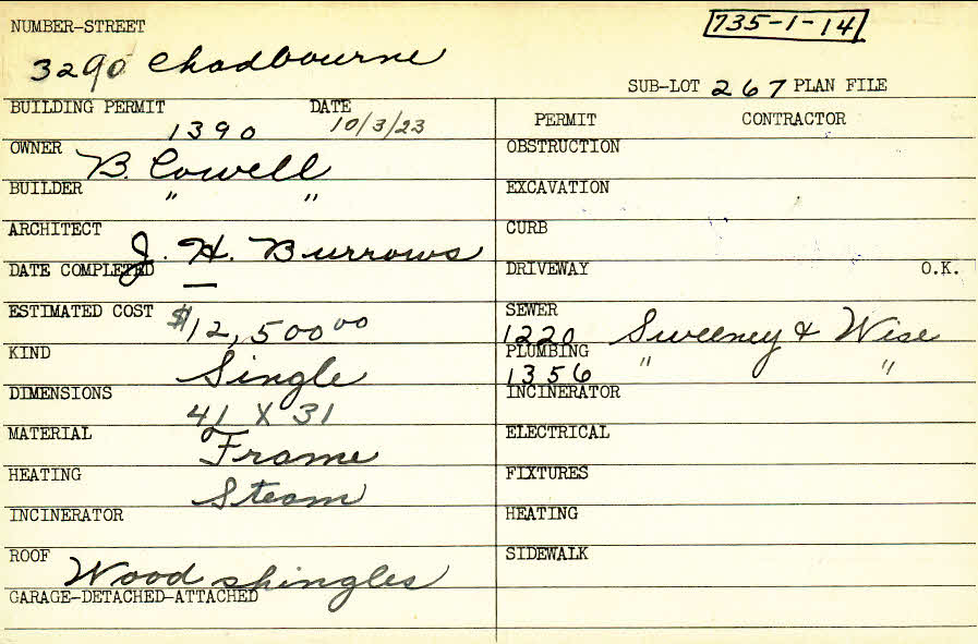 3290 Chadbourne Road Shaker Heights, OH 44120 PARCEL ID: 735-01-014 Building Permit Date: 10-03-1923 Plan File Number: 4397 Microfilm Roll: Roll#63 Neighborhood: Onaway Owner: Cowell, B. Builder: Cowell, B. Architect: Burrows, J. H. Estimated Cost: 12500 Kind: Single, Single Residence or Dwelling Material: Frame Heating: Steam Roof: Wood Shingle |