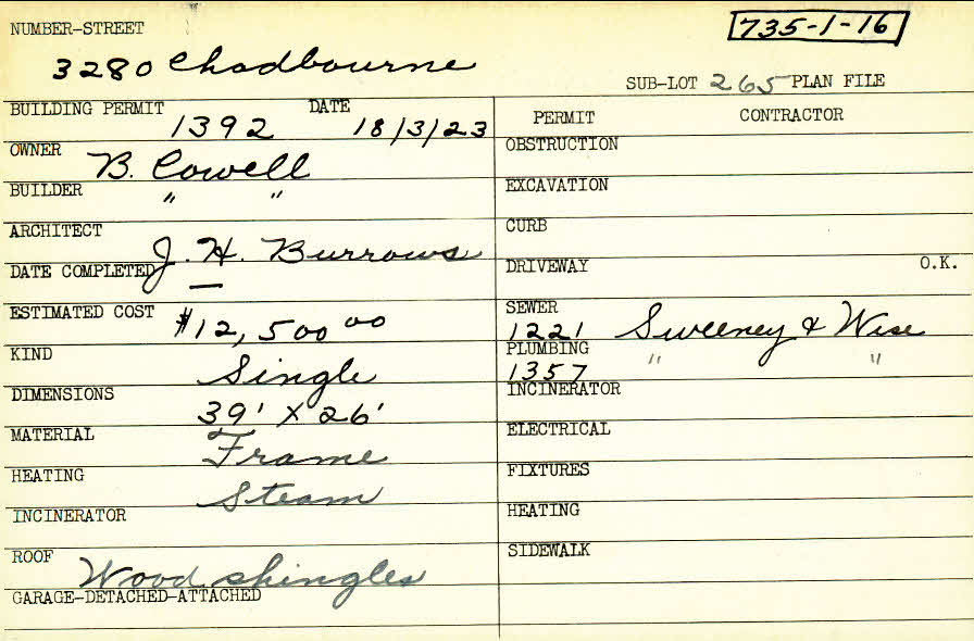 3280 Chadbourne Road Shaker Heights, OH 44120 PARCEL ID: 735-01-016 Building Permit Date: 03-18-1923 Plan File Number: 0 Microfilm Roll: NewRoll#3 Neighborhood: Onaway Owner: Cowell, B. Builder: Cowell, B. Architect: Burrows, J. H. Estimated Cost: 12500 Kind: Single, Single Residence or Dwelling Material: Frame Heating: Steam Roof: Wood Shingle |