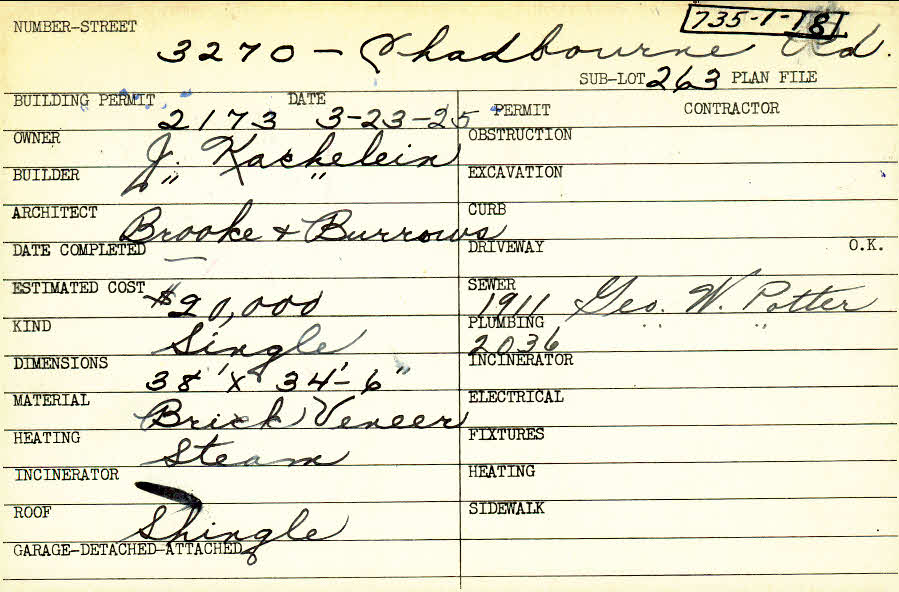 3270 Chadbourne Road Shaker Heights, OH 44120 PARCEL ID: 735-01-018 Building Permit Date: 03-23-1925 Plan File Number: 0 Neighborhood: Onaway Owner: Kachelein, J. Builder: Kachelein, J. Architect: Brooke and Burrows Estimated Cost: 20000 Kind: Single, Single Residence or Dwelling Material: Brick Veneer Heating: Steam Roof: Shingles |