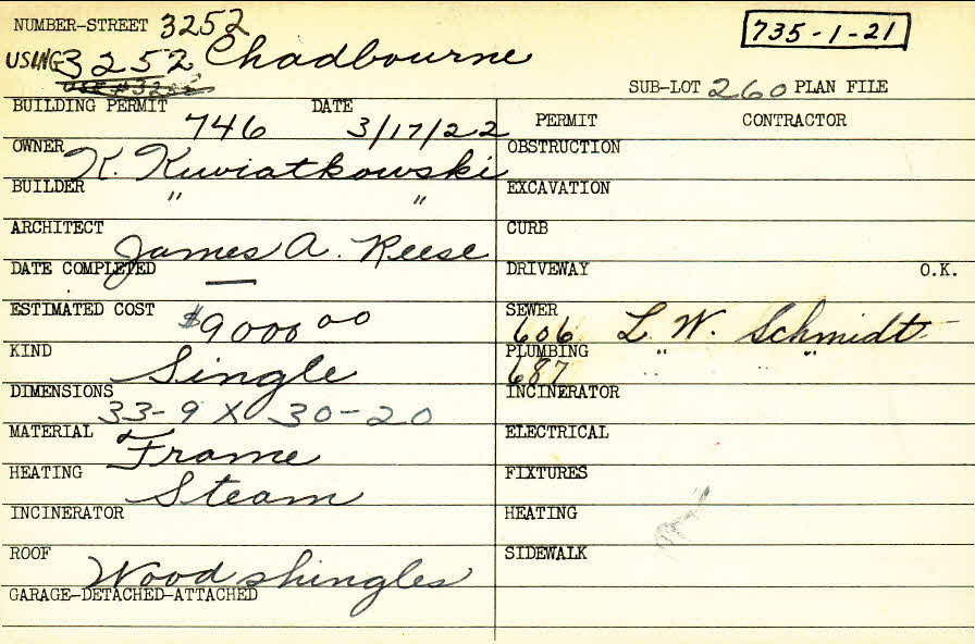 3252 Chadbourne Road Shaker Heights, OH 44120 PARCEL ID: 735-01-021 Building Permit Date: 03-17-1922 Plan File Number: 5655 Microfilm Roll: Roll#76 Neighborhood: Onaway Owner: Kwiatkowski, A. Builder: Kwiatkowski, A. Architect: Reese, James A. Estimated Cost: 9000 Kind: Single, Single Residence or Dwelling Material: Frame Heating: Steam Roof: Wood Shingle |