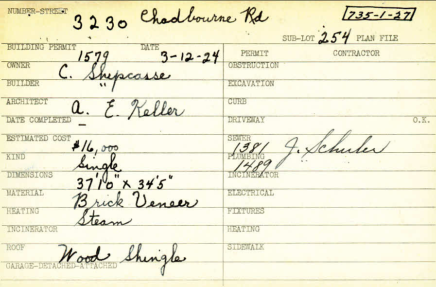 3230 Chadbourne Road Shaker Heights, OH 44120 PARCEL ID: 735-01-027 Building Permit Date: 03-12-1924 Plan File Number: 5108, 5110, 6853 Microfilm Roll: Roll#70, Roll#89 Neighborhood: Onaway Owner: Shipcasse, C. Builder: Shipcasse, C. Architect: Keller, Arthur Emil Estimated Cost: 16000 Kind: Single, Single Residence or Dwelling Material: Brick Veneer Heating: Steam Roof: Wood Shingle |