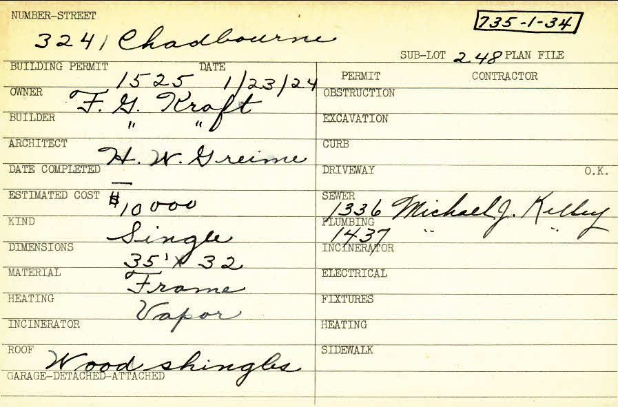 3241 Chadbourne Road Shaker Heights, OH 44120 PARCEL ID: 735-01-034 Building Permit Date: 01-23-1924 Plan File Number: 10582 Microfilm Roll: NewRoll#4 Neighborhood: Onaway Owner: Kroft, F. G. Builder: Kroft, F. G. Architect: Grieme, Henry W. Estimated Cost: 10000 Kind: Single, Single Residence or Dwelling Material: Frame Heating: Vapor Roof: Wood Shingle |