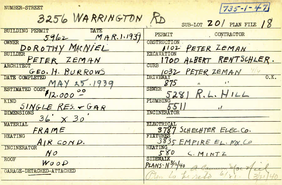 3256 Warrington Road Shaker Heights, OH 44120 PARCEL ID: 735-01-047 Building Permit Date: 03-01-1939 Neighborhood: Onaway Owner: MacNiel, Dorothy Builder: Zeman, Peter Architect: Burrows, George H. Estimated Cost: 12000 Date Completed: 05-25-1939 Kind: Single Dwelling and Garage Material: Frame Heating: Air Conditioned Roof: Wood Garage: detached Blueprints: no blueprints on microfilm |