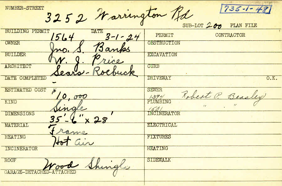 3252 Warrington Road Shaker Heights, OH 44120 PARCEL ID: 735-01-048 Building Permit Date: 03-01-1924 Plan File Number: 0 Neighborhood: Onaway Owner: Banks, John S. Builder: Price, W. J. Architect: Sears Roebuck Co. Estimated Cost: 10000 Kind: Single, Single Residence or Dwelling Material: Frame Heating: Hot Air Roof: Wood Shingle |