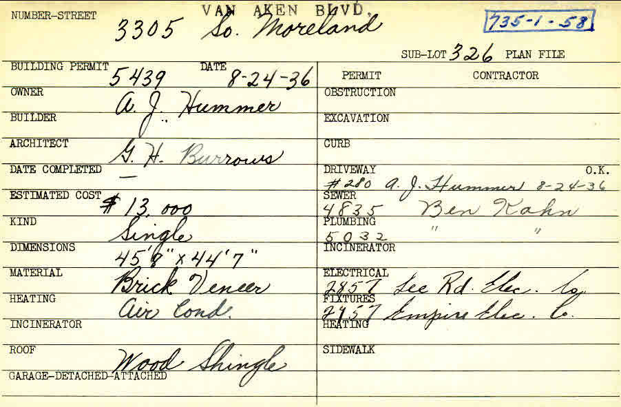 3305 Van Aken Boulevard Shaker Heights, OH 44120 PARCEL ID: 735-01-058 Building Permit Date: 08-24-1936 Plan File Number: 0 Neighborhood: Onaway Owner: Hummer, A. J. Builder: Hummer, A. J. Architect: Burrows, G. H. Estimated Cost: 13000 Kind: Single, Single Residence or Dwelling Material: Brick Veneer Heating: Air Conditioned Roof: Wood Shingle |