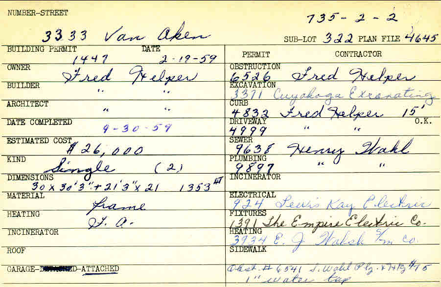3333 Van Aken Boulevard Shaker Heights, OH 44120 PARCEL ID: 735-02-002 Building Permit Date: 02-19-1959 Plan File Number: 4645 Microfilm Roll: Roll#65 Neighborhood: Onaway Owner: Helper, Fred Builder: Helper, Fred Architect: Helper, Fred Estimated Cost: 26000 Date Completed: 09-30-1959 Kind: Single, Single Residence or Dwelling (2) Material: Frame Heating: Forced Air Garage: attached |