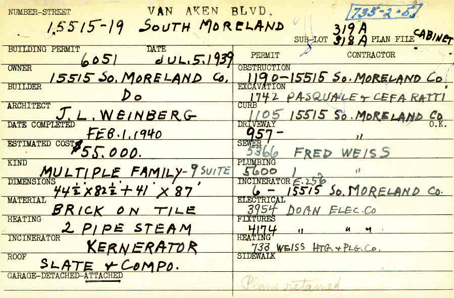 15515 Van Aken Boulevard Shaker Heights, OH 44120 PARCEL ID: 735-02-005 Building Permit Date: 07-05-1939 Plan File Number: 4279 scanned, 4459, 13166 scanned Microfilm Roll: Roll062, Roll#63, NewRoll19 Neighborhood: Moreland Owner: 15515 South Moreland Company Builder: 15515 South Moreland Company Architect: Weinberg, J. L. Estimated Cost: 55000 Date Completed: 02-01-1940 Kind: Apartment or Multi-family (3+) Material: Brick on Tile Heating: 2 Pipe Steam Roof: Slate Garage: attached |
