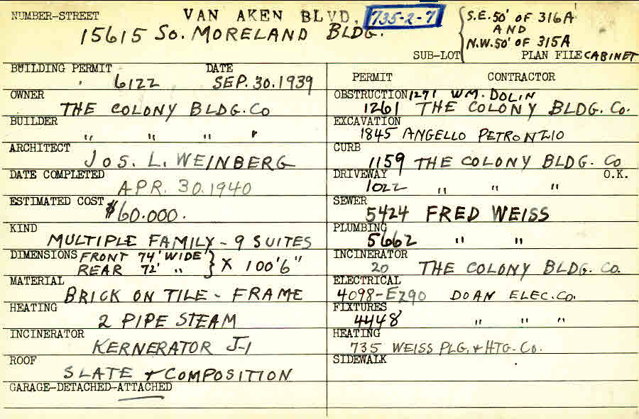 15615 Van Aken Boulevard Shaker Heights, OH 44120 PARCEL ID: 735-02-007 Building Permit Date: 09-30-1939 Plan File Number: 0 Neighborhood: Moreland Owner: The Colony Building Company Builder: The Colony Building Company Architect: Weinberg, Joseph L. Estimated Cost: 60000 Date Completed: 04-30-1940 Kind: Apartment or Multi-family (3+) Material: Brick on Tile - Frame Heating: 2 Pipe Steam Roof: Slate Garage: attached |
