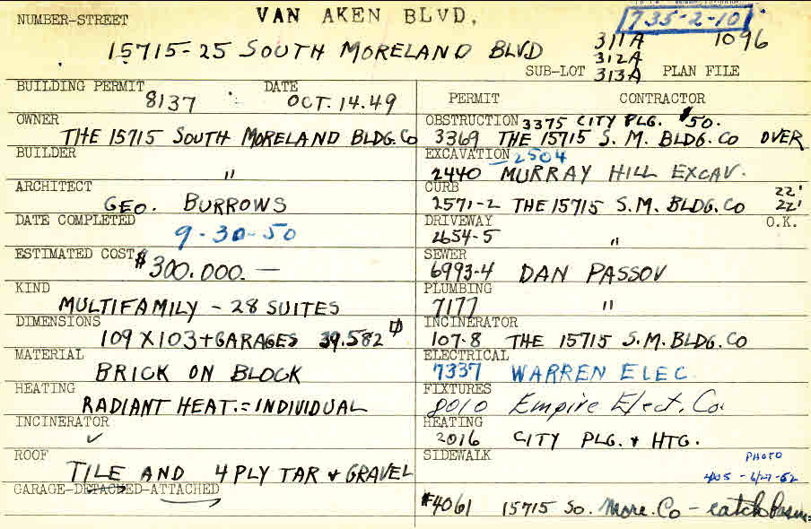 15715 Van Aken Boulevard Shaker Heights, OH 44120 PARCEL ID: 735-02-010 Building Permit Date: 10-14-1949 Plan File Number: 1096 scanned, 6127 Microfilm Roll: Roll013, Roll#83 Neighborhood: Moreland Owner: The 15715 South Moreland Building Company Builder: The 15715 South Moreland Building Company Architect: Burrows, George Estimated Cost: 300000 Date Completed: 09-30-1950 Kind: Apartment or Multi-family (3+) Material: Brick on Block Roof: Tile Garage: attached |