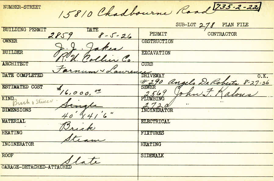 15810 Chadbourne Road Shaker Heights, OH 44120 PARCEL ID: 735-02-022 Building Permit Date: 08-05-1926 Plan File Number: 0 Owner: Jakes, J. J. Builder: R. U. Collier Company Architect: Farnam, Daniel and Lawrence, Ralph E. Estimated Cost: 16000 Kind: Single, Single Residence or Dwelling Material: Brick Heating: Steam Roof: Slate |