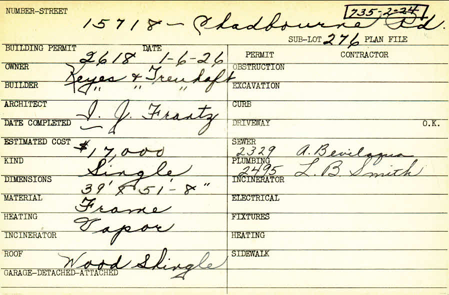 15718 Chadbourne Road Shaker Heights, OH 44120 PARCEL ID: 735-02-024 Building Permit Date: 01-06-1926 Plan File Number: 0 Neighborhood: Boulevard Owner: Keyes and Treuhaft Builder: Keyes and Treuhaft Architect: Frantz, Irvin J. Estimated Cost: 17000 Kind: Single, Single Residence or Dwelling Material: Frame Heating: Vapor Roof: Wood Shingle |
