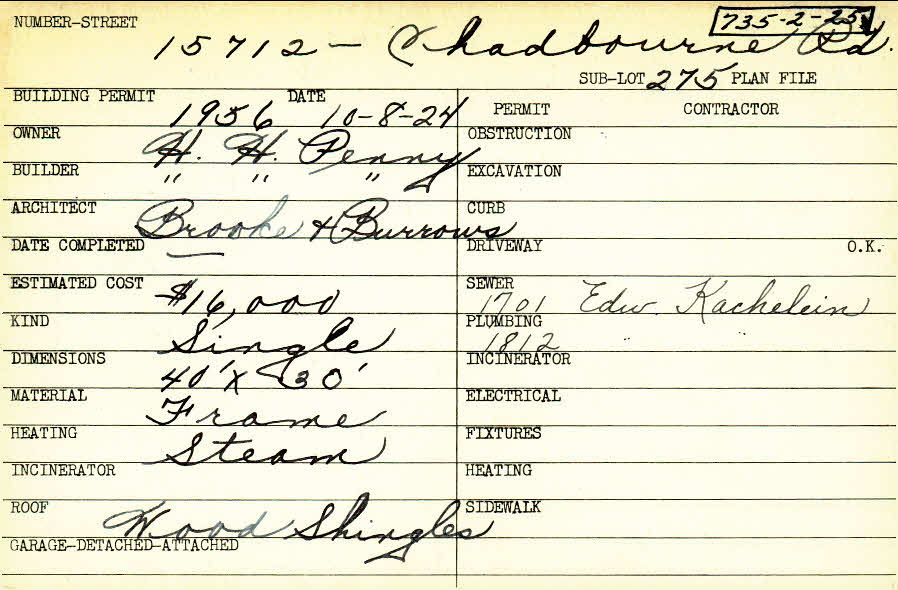 15712 Chadbourne Road Shaker Heights, OH 44120 PARCEL ID: 735-02-025 Building Permit Date: 10-08-1924 Plan File Number: 11460 Microfilm Roll: NewRoll#7 Neighborhood: Boulevard Owner: Penny, H. H. Builder: Penny, H. H. Architect: Brooke and Burrows Estimated Cost: 16000 Kind: Single, Single Residence or Dwelling Material: Frame Heating: Steam Roof: Wood Shingle |