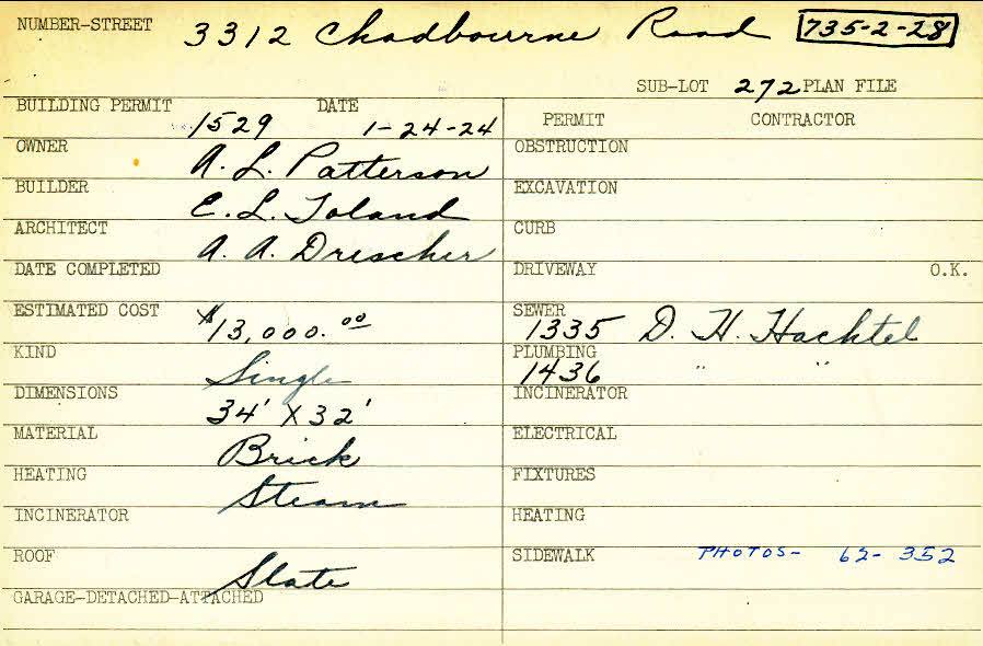 3312 Chadbourne Road Shaker Heights, OH 44120 PARCEL ID: 735-02-028 Building Permit Date: 01-24-1924 Plan File Number: 5615, 5712, 6419, 6939 all scanned Microfilm Roll: Roll076, Roll077, Roll085, Roll090 Owner: Patterson, A. L. Builder: Toland, E. L. Architect: Drescher, A. A. Estimated Cost: 13000 Kind: Single, Single Residence or Dwelling Material: Brick Heating: Steam Roof: Slate Blueprints: online, see link above |