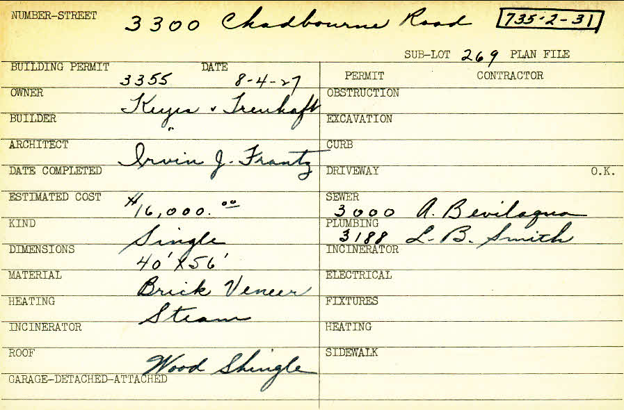 3300 Chadbourne Road Shaker Heights, OH 44120 PARCEL ID: 735-02-031 Building Permit Date: 08-04-1927 Plan File Number: 7265 Microfilm Roll: Roll#92 Neighborhood: Onaway Owner: Keyes and Treuhaft Builder: Keyes and Treuhaft Architect: Frantz, Irvin J. Estimated Cost: 16000 Kind: Single, Single Residence or Dwelling Material: Brick Veneer Heating: Steam Roof: Wood Shingle |