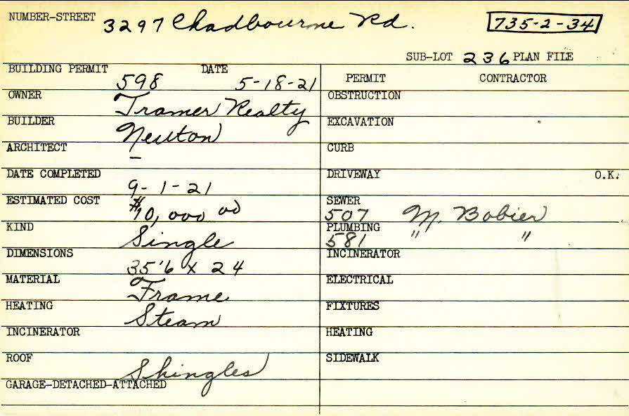 3297 Chadbourne Road Shaker Heights, OH 44120 PARCEL ID: 735-02-034 Building Permit Date: 05-18-1921 Plan File Number: 0 Neighborhood: Onaway Owner: Tramer Realty Builder: Neuton Estimated Cost: 10000 Date Completed: 09-01-1921 Kind: Single, Single Residence or Dwelling Material: Frame Heating: Steam Roof: Shingles |