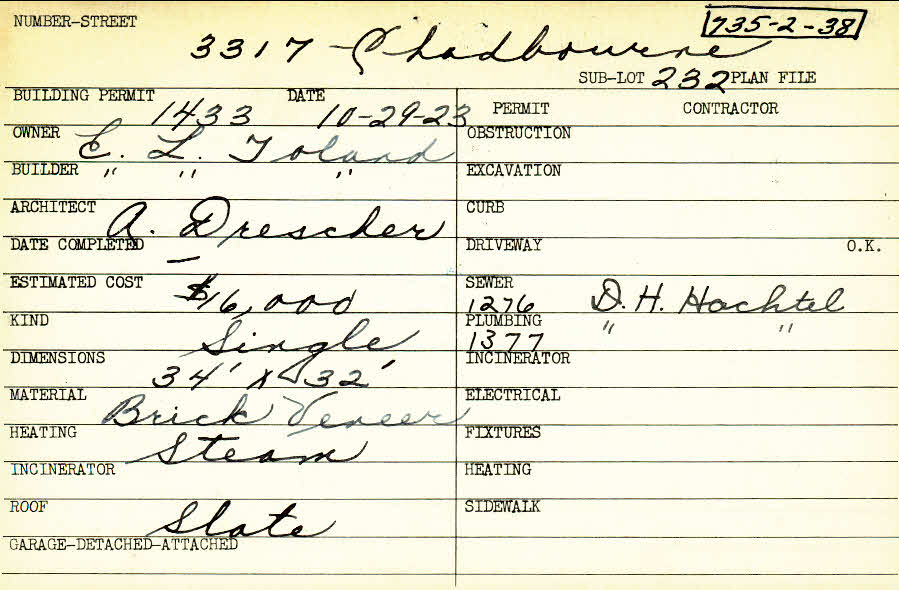 3317 Chadbourne Road Shaker Heights, OH 44120 PARCEL ID: 735-02-038 Building Permit Date: 10-29-1923 Plan File Number: 2783 Microfilm Roll: Roll #38 Owner: Toland, E. L. Builder: Toland, E. L. Architect: Drescher, A. A. Estimated Cost: 16000 Kind: Single, Single Residence or Dwelling Material: Brick Veneer Heating: Steam Roof: Slate |
