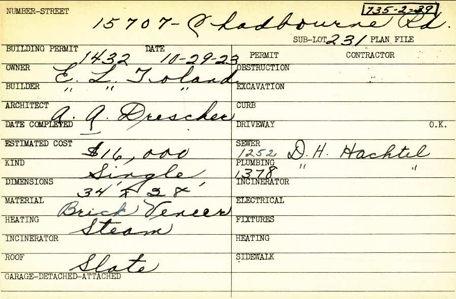 15707 Chadbourne Road Shaker Heights, OH 44120 PARCEL ID: 735-02-039 Building Permit Date: 10-29-1923 Plan File Number: 4971 Microfilm Roll: Roll#68 Neighborhood: Boulevard Owner: Toland, E. L. Builder: Toland, E. L. Architect: Drescher, A. A. Estimated Cost: 16000 Kind: Single, Single Residence or Dwelling Material: Brick Veneer Heating: Steam Roof: Slate |