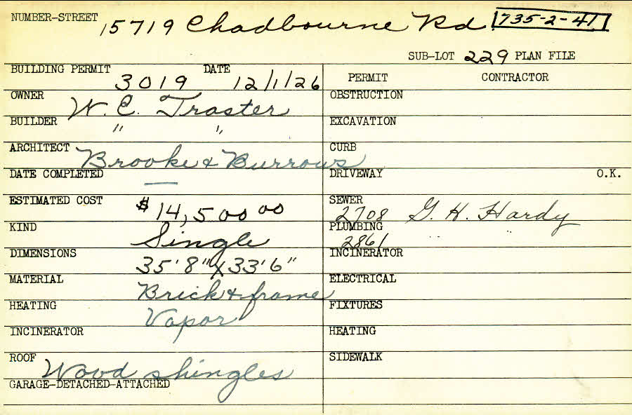 15719 Chadbourne Road Shaker Heights, OH 44120 PARCEL ID: 735-02-041 Building Permit Date: 12-01-1926 Plan File Number: 2019 Microfilm Roll: Roll#31 Neighborhood: Boulevard Owner: Traster, W. E. Builder: Traster, W. E. Architect: Brooke and Burrows Estimated Cost: 14500 Kind: Single, Single Residence or Dwelling Material: Brick and Frame Heating: Vapor Roof: Wood Shingle |