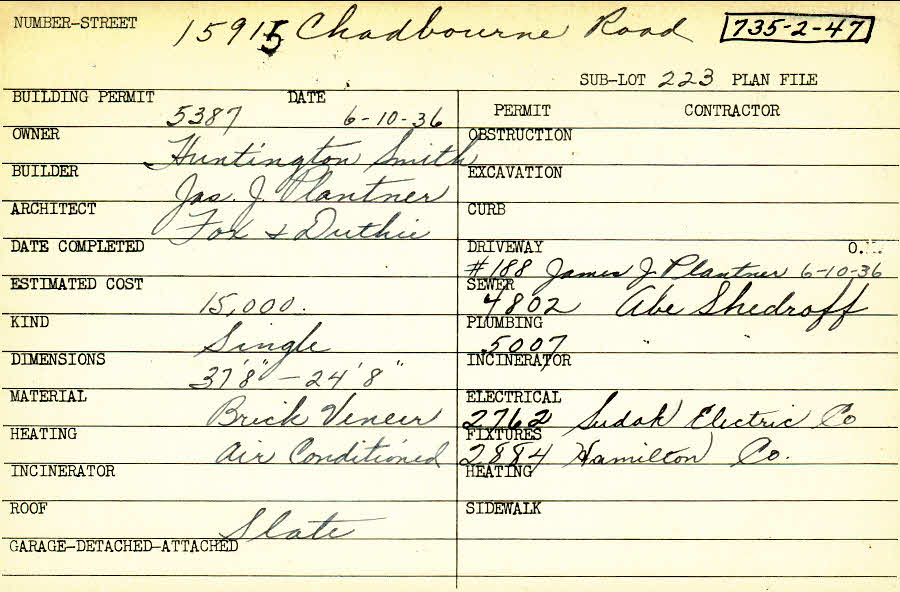 15915 Chadbourne Road Shaker Heights, OH 44120 PARCEL ID: 735-02-047 Building Permit Date: 06-10-1936 Plan File Number: 10891 Microfilm Roll: NewRoll#6 Neighborhood: Boulevard Owner: Smith, Huntington Builder: Plantner, James J. Architect: Fox and Duthie Estimated Cost: 15000 Kind: Single, Single Residence or Dwelling Material: Brick Veneer Heating: Air Conditioned Roof: Slate |