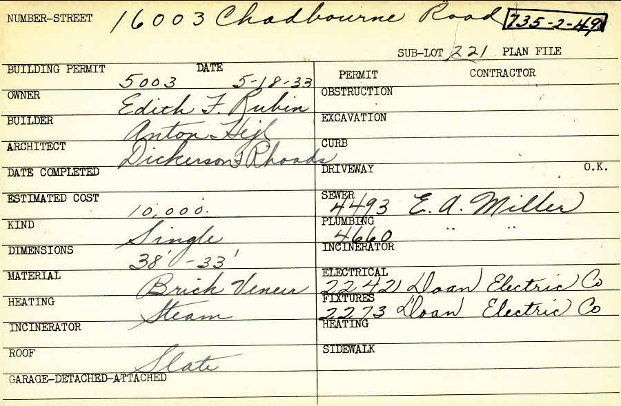 16003 Chadbourne Road Shaker Heights, OH 44120 PARCEL ID: 735-02-049 Building Permit Date: 05-18-1933 Plan File Number: 0 Neighborhood: Boulevard Owner: Rubin, Edith F. Builder: Hejl, Anton Architect: Dickerson and Rhoads Estimated Cost: 10000 Kind: Single, Single Residence or Dwelling Material: Brick Veneer Heating: Steam Roof: Slate |