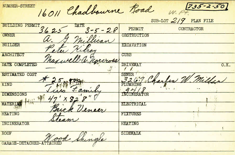 16011 Chadbourne Road Shaker Heights, OH 44120 PARCEL ID: 735-02-050 Building Permit Date: 03-05-1928 Plan File Number: 0 Neighborhood: Boulevard Owner: Millican, A. G. Builder: Kilroy, Peter Architect: Norcross, Maxwell A. Estimated Cost: 25000 Kind: Duplex or Two-Family Material: Brick Veneer Heating: Steam Roof: Wood Shingle |