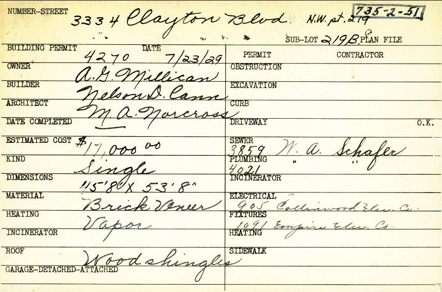 3334 Clayton Boulevard Shaker Heights, OH 44120 PARCEL ID: 735-02-051 Building Permit Date: 07-23-1929 Neighborhood: Onaway Owner: Millican, A. G. Builder: Cann, Nelson D. Architect: Norcross, M. A. Estimated Cost: 17000 Kind: Single, Single Residence or Dwelling Material: Brick Veneer Heating: Vapor Roof: Wood Shingle |