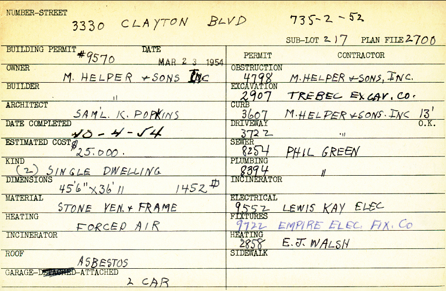 3330 Clayton Boulevard Shaker Heights, OH 44120 PARCEL ID: 735-02-052 Building Permit Date: 03-23-1954 Plan File Number: 2178, 2700, 2083 Microfilm Roll: Roll#33, Roll #37, Roll#32 Neighborhood: Onaway Owner: M. Helper and Sons, Inc. Builder: M. Helper and Sons, Inc. Architect: Popkins, Samuel K. Estimated Cost: 25000 Date Completed: 10-04-1954 Kind: Single, Single Residence or Dwelling (2) Material: Stone Veneer and Frame Heating: Forced Air Roof: Asbestos Garage: attached 2 car |