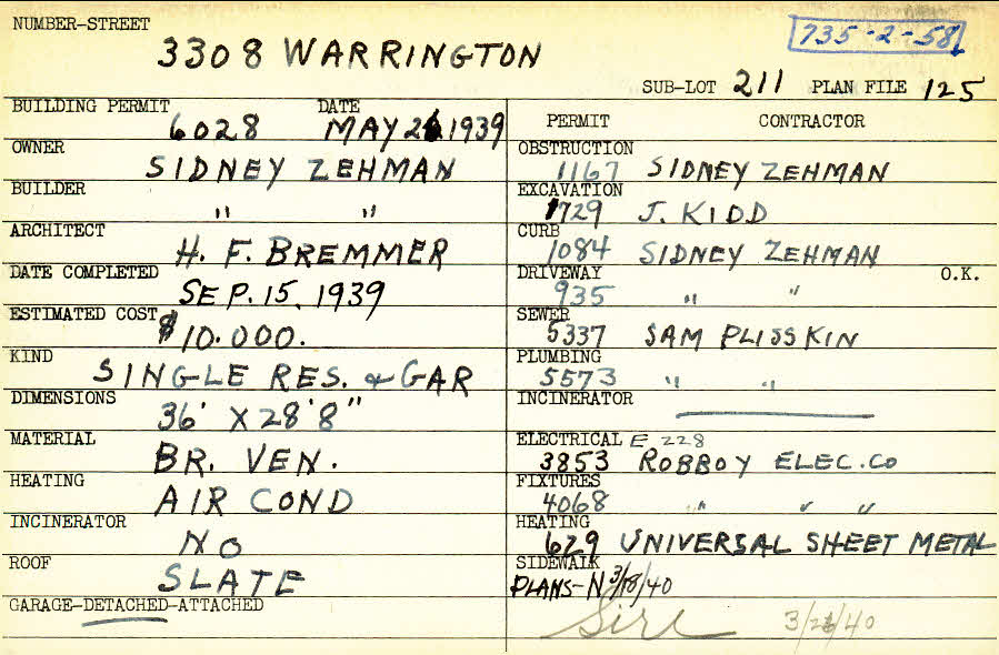 3308 Warrington Road Shaker Heights, OH 44120 PARCEL ID: 735-02-058 Building Permit Date: 05-26-1939 Plan File Number: 125, 7320, 10637 Microfilm Roll: Roll#92, NewRoll#5 Neighborhood: Onaway Owner: Zehman, Sidney Builder: Zehman, Sidney Architect: Bremmer, Harry F. Estimated Cost: 10000 Date Completed: 09-15-1939 Kind: Single Dwelling and Garage Material: Brick Veneer Heating: Air Conditioned Roof: Slate Garage: detached |