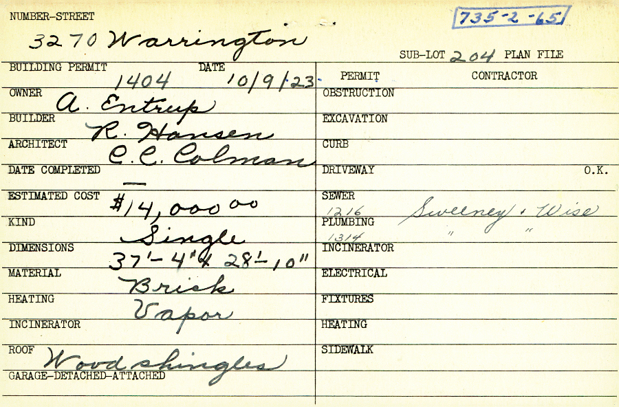 3270 Warrington Road Shaker Heights, OH 44120 PARCEL ID: 735-02-064 Building Permit Date: 10-09-1923 Plan File Number: 12236 Microfilm Roll: NewRoll#11 Neighborhood: Onaway Owner: Entrup, A. Builder: Hansen, R. Architect: Colman, Charles C. Estimated Cost: 14000 Kind: Single, Single Residence or Dwelling Material: Brick Heating: Vapor Roof: Wood Shingle Card Available: Yes |