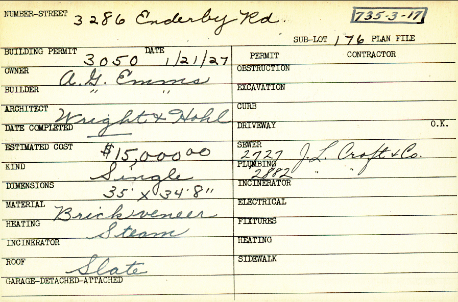 3286 Enderby Road Shaker Heights, OH 44120 PARCEL ID: 735-03-017 Building Permit Date: 01-21-1927 Plan File Number: 265 scanned, 10647, 10829 Microfilm Roll: Roll002, NewRoll#5, NewRoll#6 Neighborhood: Onaway Owner: Emms, A. G. Builder: Emms, A. G. Architect: Robert M. Wright and Russell L. Hohl Estimated Cost: 15000 Kind: Single, Single Residence or Dwelling Material: Brick Veneer Heating: Steam Roof: Slate |