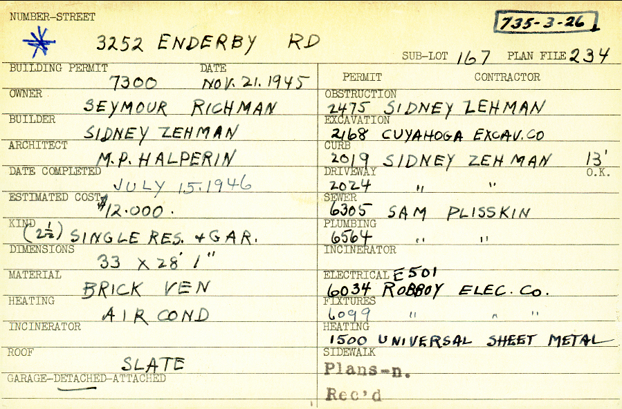 3252 Enderby Road Shaker Heights, OH 44120 PARCEL ID: 735-03-026 Building Permit Date: 11-21-1945 Plan File Number: 234 scanned, 7713 Microfilm Roll: Roll002, Roll#94 Neighborhood: Onaway Owner: Richman, Seymour Builder: Zehman, Sidney Architect: Halperin, M. P. Estimated Cost: 12000 Date Completed: 07-15-1946 Kind: Single 2-1/2 Material: Brick Veneer Heating: Air Conditioned Roof: Slate Garage: detached |