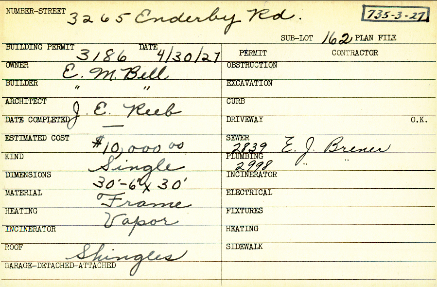 3265 Enderby Road Shaker Heights, OH 44120 PARCEL ID: 735-03-027 Building Permit Date: 04-30-1927 Plan File Number: 0 Neighborhood: Onaway Owner: Bell, E. M. Builder: Bell, E. M. Architect: Reeb, J. E. Estimated Cost: 10000 Kind: Single, Single Residence or Dwelling Material: Frame Heating: Vapor Roof: Shingles Card Available: yes |