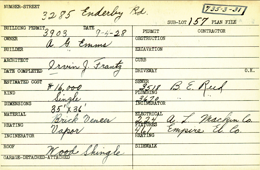 3285 Enderby Road Shaker Heights, OH 44120 PARCEL ID: 735-03-031 Building Permit Date: 09-04-1928 Plan File Number: 12349 Microfilm Roll: NewRoll#12 Neighborhood: Onaway Owner: Emms, A. G. Builder: Emms, A. G. Architect: Frantz, Irvin J. Estimated Cost: 16000 Kind: Single, Single Residence or Dwelling Material: Brick Veneer Heating: Vapor Roof: Wood Shingle |