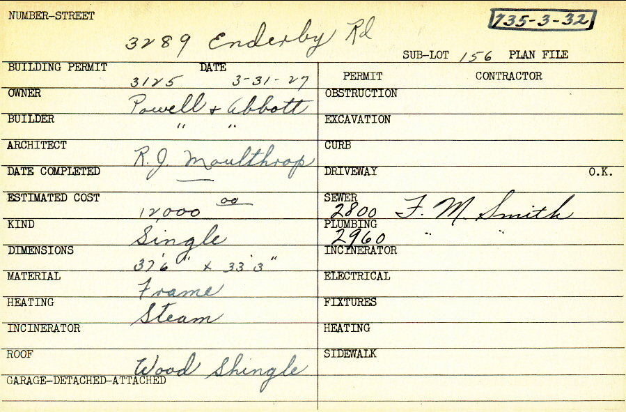 3289 Enderby Road Shaker Heights, OH 44120 PARCEL ID: 735-03-032 Building Permit Date: 03-31-1927 Plan File Number: 0 Neighborhood: Onaway Owner: Powell and Abbott Builder: Powell and Abbott Architect: Moulthrop, R. J. Estimated Cost: 12000 Kind: Single, Single Residence or Dwelling Material: Frame Heating: Steam Roof: Wood Shingle |
