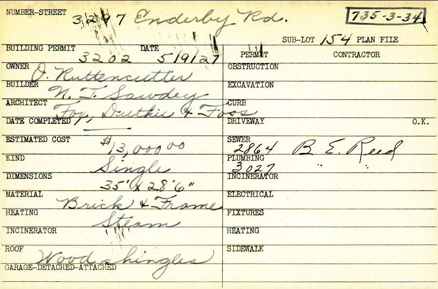 3297 Enderby Road Shaker Heights, OH 44120 PARCEL ID: 735-03-034 Building Permit Date: 05-09-1927 Plan File Number: 0 Neighborhood: Onaway Owner: Ruttencutter, O. Builder: Sawdey, N. T. Architect: Fox, Duthie and Foose Estimated Cost: 13000 Kind: Single, Single Residence or Dwelling Material: Brick and Frame Heating: Steam Roof: Wood Shingle |