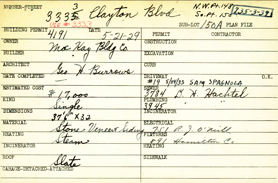 3333 Clayton Boulevard Shaker Heights, OH 44120 PARCEL ID: 735-03-039 Building Permit Date: 05-21-1929 Plan File Number: 4841 Microfilm Roll: Roll#66 Neighborhood: Onaway Owner: McKay Building Company Builder: McKay Building Company Architect: Burrows, George H. Estimated Cost: 17000 Kind: Single, Single Residence or Dwelling Material: Stone Veneer and Siding Heating: Steam Roof: Slate |