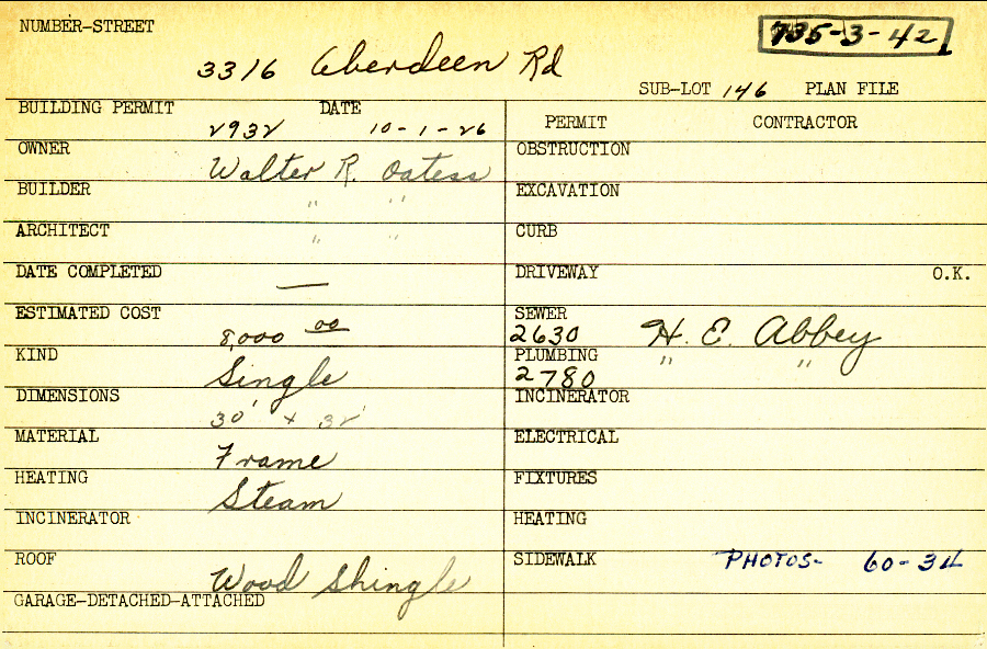 3316 Aberdeen Road Shaker Heights, OH 44120 PARCEL ID: 735-03-042 Building Permit Date: 10-01-1926 Plan File Number: 92-124 Microfilm Roll: NewRoll#1 Neighborhood: Onaway Owner: Oatess, Walter R. Builder: Oatess, Walter R. Architect: Oatess, Walter R. Estimated Cost: 8000 Kind: Single, Single Residence or Dwelling Material: Frame Heating: Steam Roof: Wood Shingle |  |