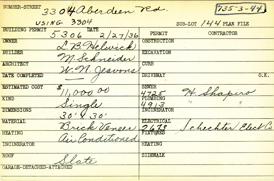 3304 Aberdeen Road Shaker Heights, OH 44120 PARCEL ID: 735-03-044 Building Permit Date: 02-27-1936 Plan File Number: 10892 Microfilm Roll: NewRoll#6 Neighborhood: Onaway Owner: Helwick, L. B. Builder: Schneider, M. Architect: Jeavons, W. N. Estimated Cost: 11000 Kind: Single, Single Residence or Dwelling Material: Brick Veneer Heating: Air Conditioned Roof: Slate |  |