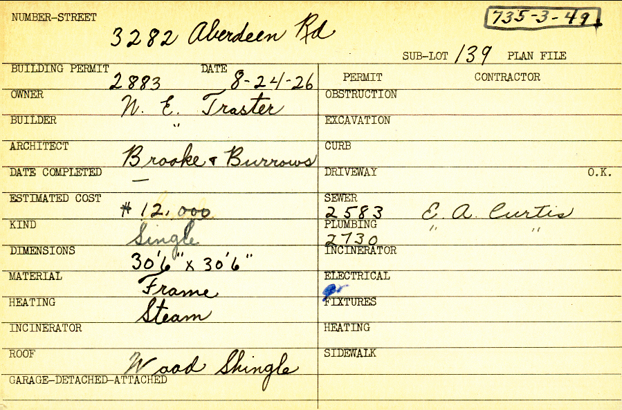 3282 Aberdeen Road Shaker Heights, OH 44120 PARCEL ID: 735-03-049 Building Permit Date: 08-24-1926 Neighborhood: Onaway Owner: Traster, N. E. Builder: Traster, N. E. Architect: Brooke and Burrows Estimated Cost: 12000 Kind: Single, Single Residence or Dwelling Material: Frame Heating: Steam Roof: Wood Shingle Blueprints: no blueprints on microfilm |  |