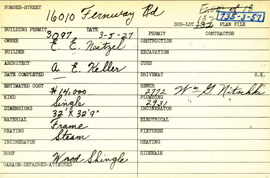 16010 Fernway Road Shaker Heights, OH 44120 PARCEL ID: 735-03-057 Building Permit Date: 03-05-1927 Plan File Number: 0 Neighborhood: Onaway Owner: Neitzel, E. E. Builder: Neitzel, E. E. Architect: Keller, Arthur Emil Estimated Cost: 14000 Kind: Single, Single Residence or Dwelling Material: Frame Heating: Steam Roof: Wood Shingle |