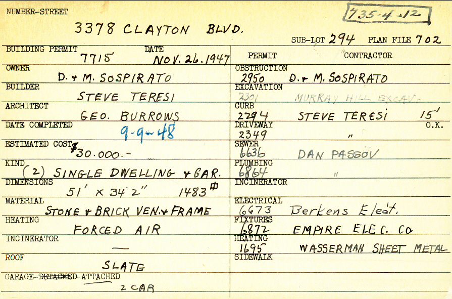 3378 Clayton Boulevard Shaker Heights, OH 44120 PARCEL ID: 735-04-012 Building Permit Date: 11-26-1947 Plan File Number: 702 all scanned Microfilm Roll: Roll010 Neighborhood: Onaway Owner: D. and M. Sospirato Builder: Teresi, Steve Architect: Burrows, George Estimated Cost: 30000 Date Completed: 09-09-1948 Kind: Single Dwelling and Garage (2) Material: Stone and Brick Veneer and Frame Heating: Forced Air Roof: Slate Garage: attached 2 car |
